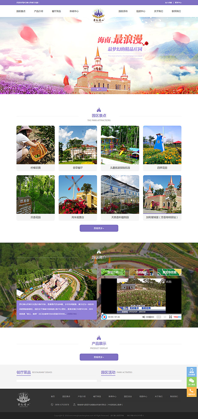 園區(qū)種植了300畝檸檬,200畝數(shù)十種芳香苗木,5000株十二年生沉香樹,100畝熱帶水果。夢幻香山芳香文化園開放景點(diǎn)有: 加利坡城堡、天然香料植物園、玫瑰園、芳香文化廣場、風(fēng)車觀景臺、沉香花園、野牡丹谷、四季花田、兒童拓展探險樂園、鳳凰山莊、金源城堡、h水畔垂釣、愛情山、芳香世界、香草主題餐廳。夢幻香山芳香文化園占地650畝,是集現(xiàn)代農(nóng)業(yè)種植、鄉(xiāng)村休閑旅游、香文化為一體的休閑度假旅游景區(qū)。園區(qū)位于海南中線高速公路74公里處,距省會??谲嚦?0分鐘,沿中線高速“坡心、南坤”出口往南坤方向出匝道300米處,交通非常便利。園區(qū)著力打造“看香山、走香道、聞香氣、品香茶、吃香餐、購香物、采香果、睡香房、洗香浴、結(jié)香緣”的芳香養(yǎng)生全體驗(yàn),努力實(shí)現(xiàn)“海南浪漫、夢幻的精品莊園;中國好的芳香體驗(yàn)園;世界級的香文化產(chǎn)業(yè)園”。園區(qū)在2013年8月被海南省政府認(rèn)定為海南省文化產(chǎn)業(yè)重點(diǎn)項目,2014年、2015年、2016年連續(xù)三年都被確定為海南省重點(diǎn)建設(shè)項目。2014年4月被認(rèn)定為海南省鄉(xiāng)村旅游示范單位,2015年9月被海南省農(nóng)業(yè)廳評為“海南省標(biāo)準(zhǔn)化生產(chǎn)示范園”,2016年被評為“海南省熱帶觀光四季果園”、“海南省休閑農(nóng)業(yè)示范點(diǎn)”以及國家級“熱作標(biāo)準(zhǔn)化生產(chǎn)示范園”。同時被列為“海南建設(shè)絲綢之路和引進(jìn)21世紀(jì)海上絲綢之路實(shí)施方案”項目,并入選國家旅游局“2016全國優(yōu)選旅游項目名錄”。園區(qū)利用香草植物深加工提煉的“芳香系列”產(chǎn)品,在2015年5月海南農(nóng)博會首屆旅游商品評選活動中獲得了旅游商品“二等獎”;選用園區(qū)種植的沉香樹秘制的《沉香魚頭》在2016年海南農(nóng)博會上被評為屯昌“十大名菜肴”。園區(qū)種植了300畝檸檬,200畝數(shù)十種芳香苗木,5000株十二年生沉香樹,100畝熱帶水果。