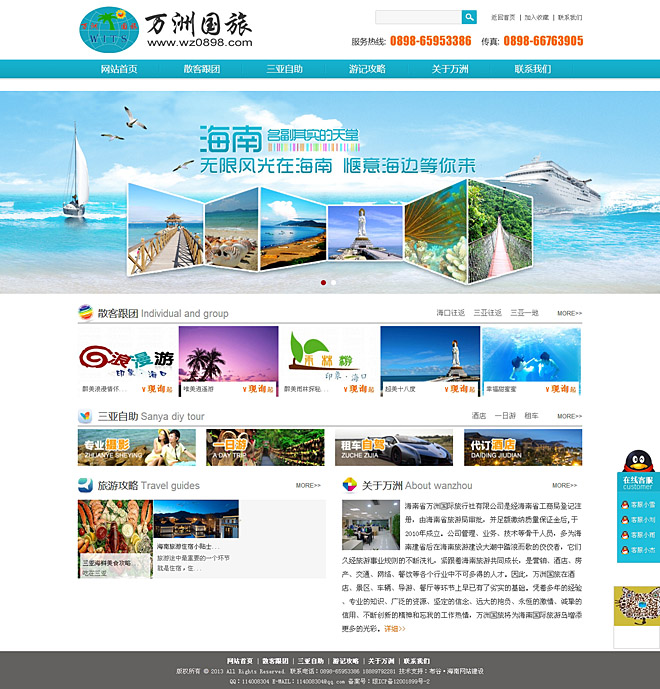 海南省萬洲國際旅行社有限公司是經(jīng)海南省工商局登記注冊,由海南省旅游局審批,并足額繳納質(zhì)量保證金后,于2010年成立。公司管理、業(yè)務(wù)、技術(shù)等骨干人員,多為海南建省后在海南旅游建設(shè)大潮中踏浪而歌的佼佼者,它們久經(jīng)旅游事業(yè)規(guī)則的不斷洗禮,緊跟著海南旅游共同成長,是營銷、酒店、房產(chǎn)、交通、網(wǎng)絡(luò)、餐飲等各個行業(yè)中不可多得的人才。因此,萬洲國旅在酒店、景區(qū)、車輛、導(dǎo)游、餐廳等環(huán)節(jié)上早已有了劣實的基礎(chǔ)。憑著多年的經(jīng)驗 、專業(yè)的知識、廣泛的資源、堅定的信念、遠(yuǎn)大的抱負(fù)、永恒的激情、誠摯的信用、不斷創(chuàng)新的精神和忘我的工作熱情,萬洲國旅將為海南國際旅游島增添更多的光彩。