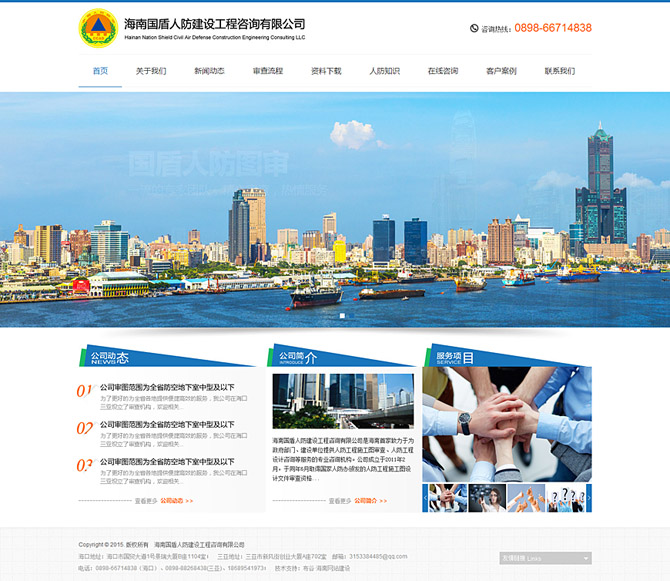 海南國盾人防建設(shè)工程咨詢有限公司是海南首家致力于為政府部門、建設(shè)單位提供人防工程施工圖審查、人防工程設(shè)計咨詢等服務(wù)的專業(yè)咨詢機構(gòu)。公司成立于2011年3月,于同年6月取得國家人防辦頒發(fā)的人防工程施工圖設(shè)計文件審查資格證。現(xiàn)有各專業(yè)審查人員18人, 其中建筑專業(yè)4人,結(jié)構(gòu)專業(yè)4人,通風(fēng)專業(yè)3人,電氣專業(yè)4人,給排水專業(yè)3人。全部具有國家認(rèn)證的注冊工程師資格及人防專項審查師資格。